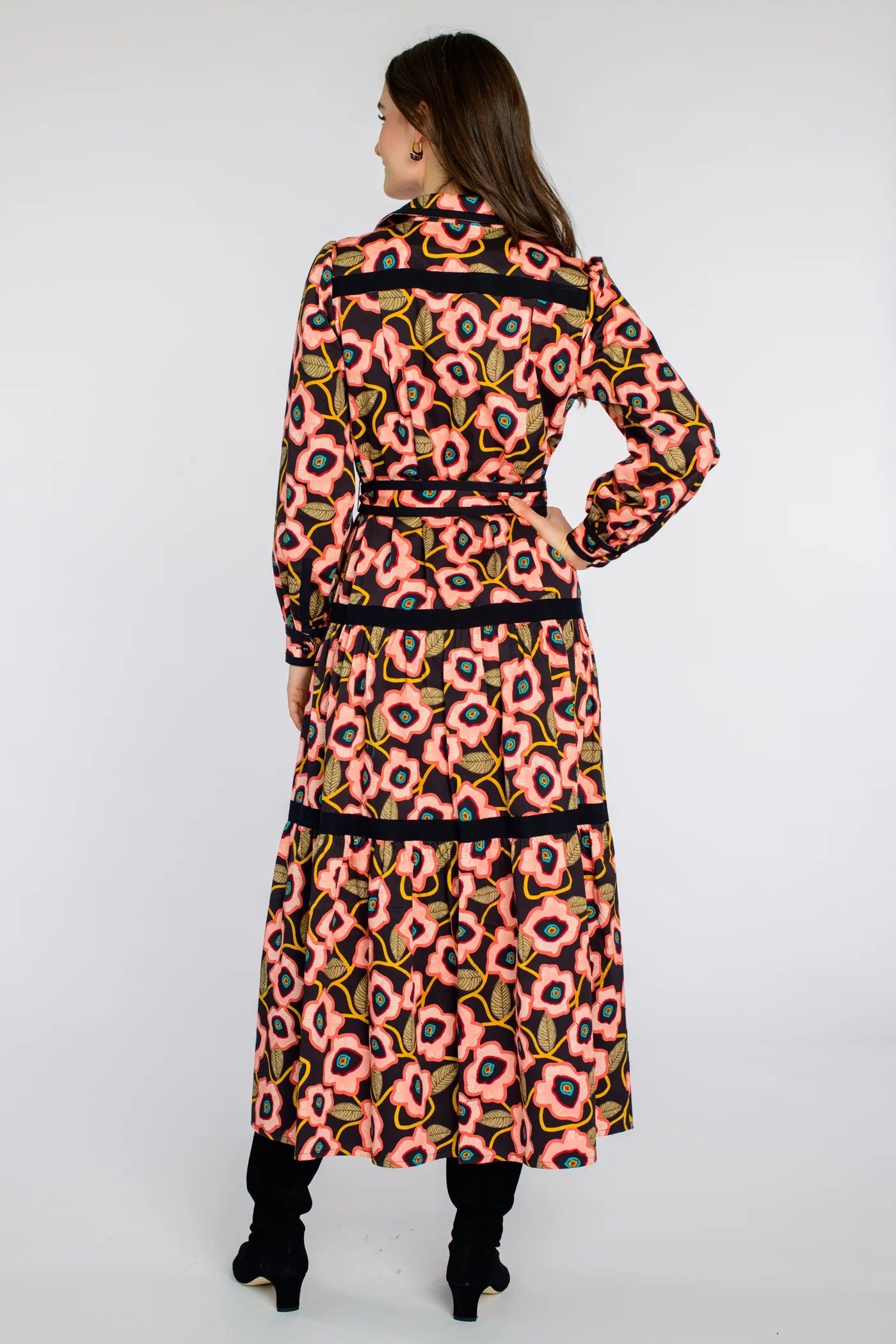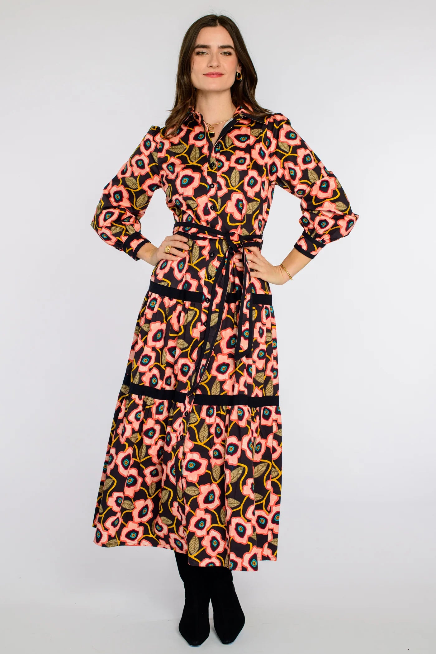 Beverly is a gorgeous long sleeve, midi-length shirt dress with balloon sleeves, a front placket, and tiered skirt. Her sash belt and skirt tiers are trimmed in black ribbon, beautifully complementing her Poppies print.