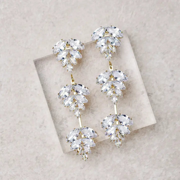 Measuring 3 inches in length. These dazzling earrings feature three intricate crystal palm leaf motifs that capture the light beautifully, adding a touch of sparkle to your Christmas and New Years looks.