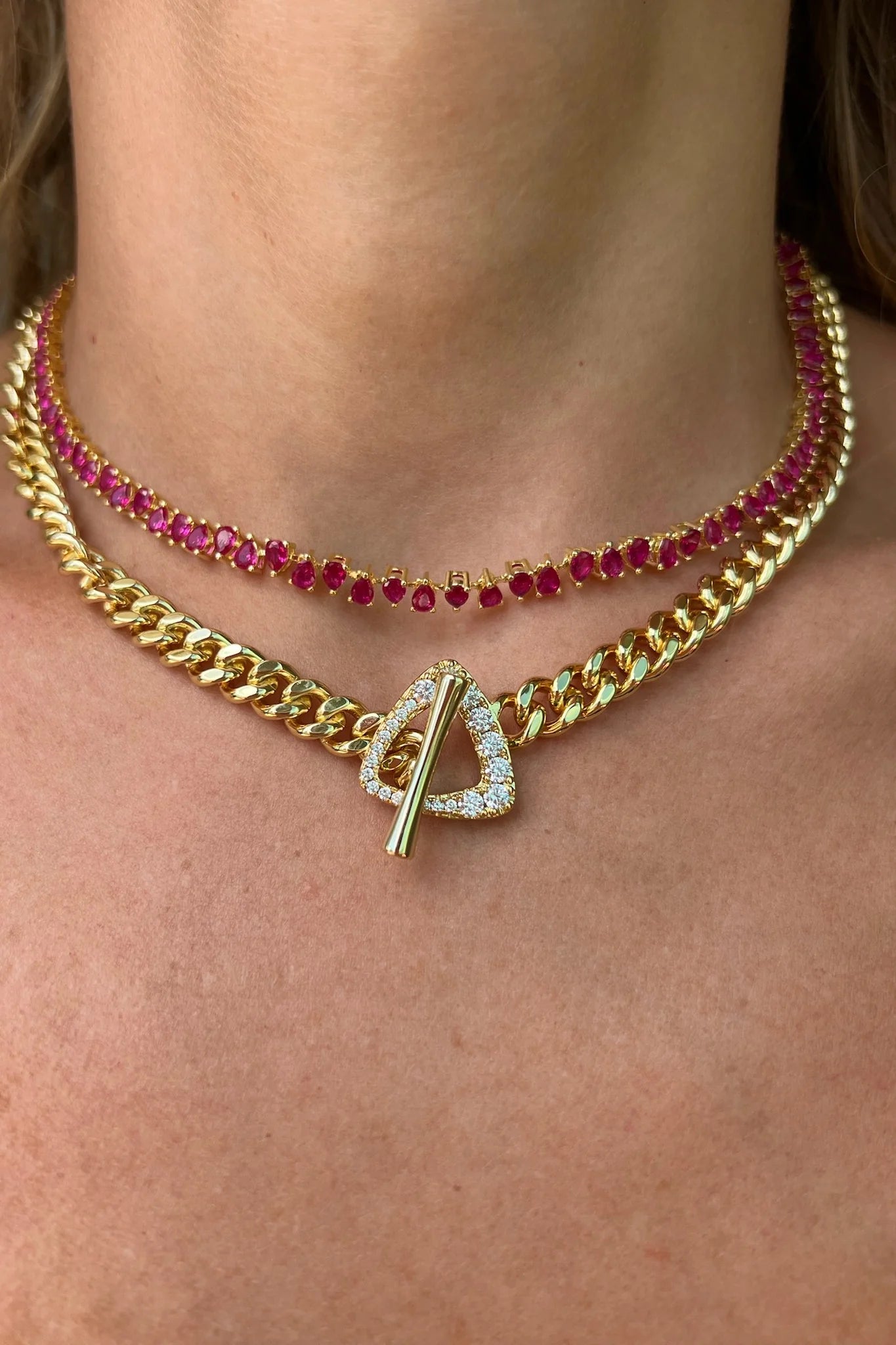 14K gold vermeil multi teardrop ruby cz necklace. Measuring 16 Inches and features a beautifully made lay flat and double locking clasp.