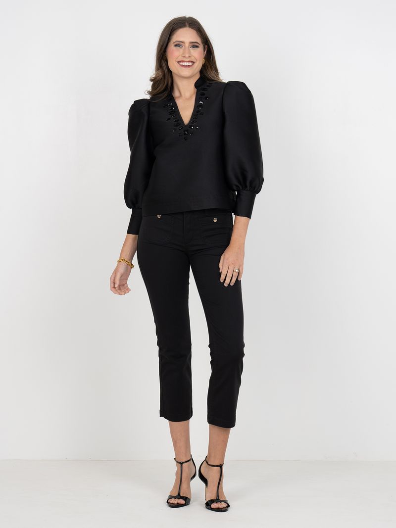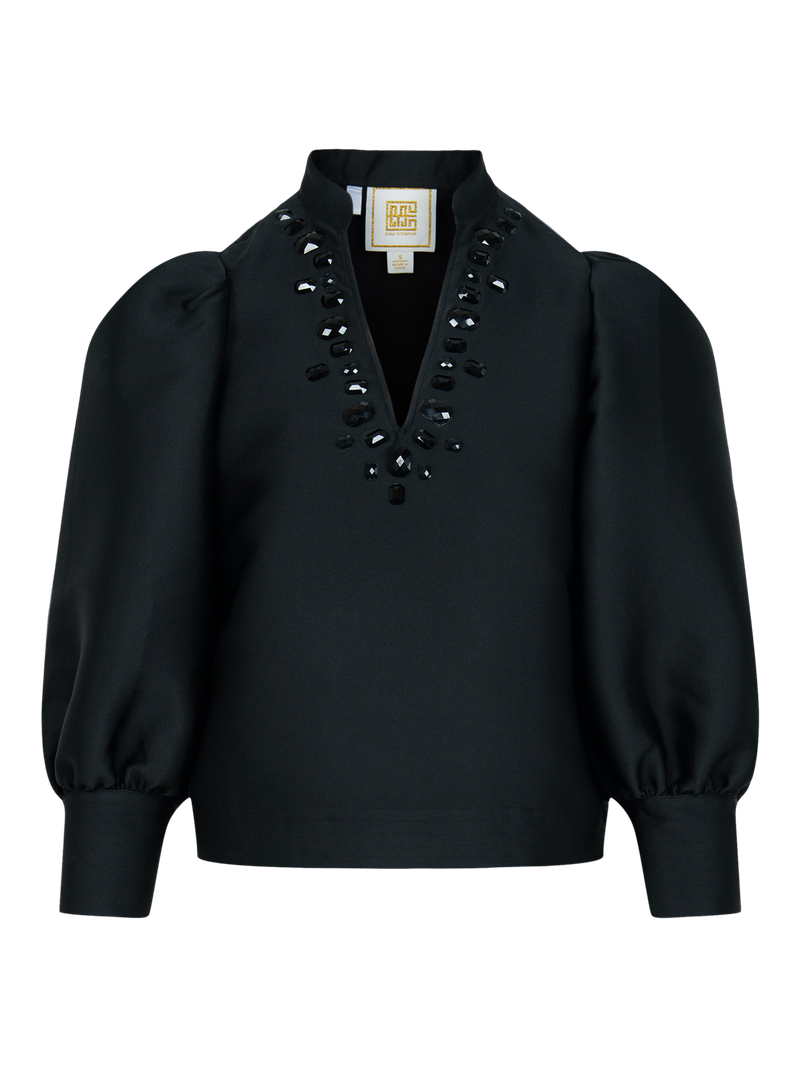 The Hampton Top in Midnight is structured perfection, designed with a lustrous finish and a hand-stoned neckline for an elevated touch. A mandarin-style collar frames the neckline, while puff sleeves with tapered cuffs add volume and balance. Its boxy yet tailored silhouette creates a refined shape that feels both modern and timeless. Style it with the matching Audrey Skirt for a tasteful statement look that’s perfect for elevated occasions this season.
