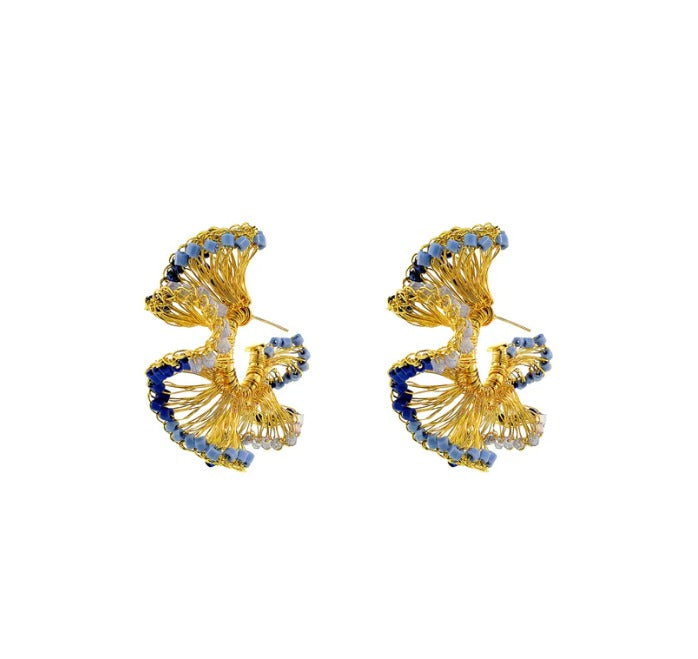 These fun ruffled, hand-crocheted hoops were fabricated by highly skilled Brazilian artisans. They feature 18 karat gold-filled copper wire and a rich combination of crystals in blue tones that create a statement look without the weight or bulk! These are very comfortable to wear and perfect for every occasion, from day to day use or even a more special celebration! Made from non-allergenic (hypoallergenic) and nickel-free. Stunning jewelry that will last for a lifetime. Each pair of earrings takes hours to finish. The result is a remarkable piece of jewelry. This piece is 100% Hand Crocheted made with 18k Gold filled wire in Brazil.