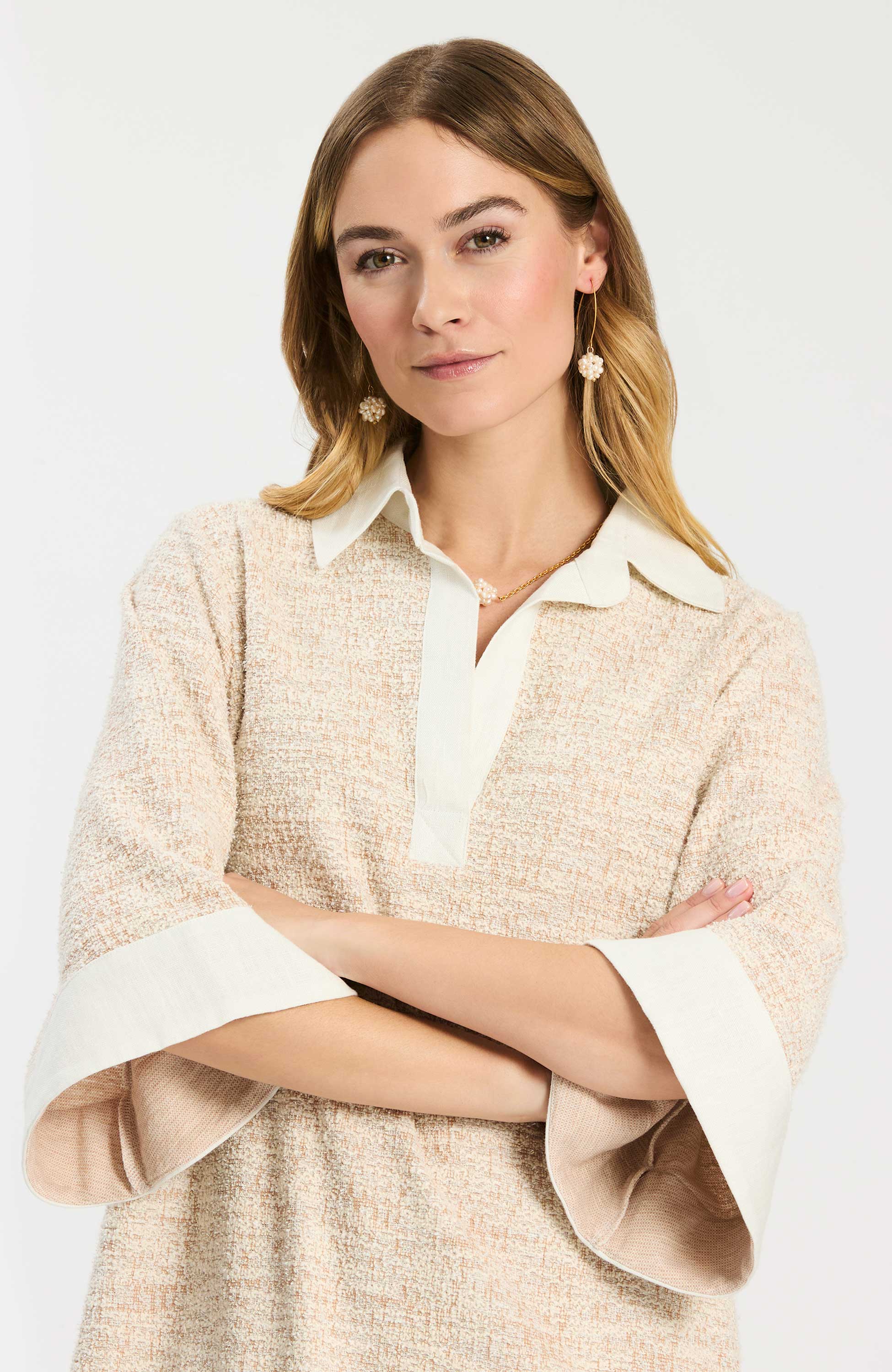 This effortlessly polished dress is crafted in a richly textured knit that adds depth, structure, and an elevated feel. Designed with soft bell sleeves and an easy, flattering silhouette, it strikes the perfect balance of comfort and sophistication. A crisp linen-trimmed split neckline brings a fresh, tailored contrast that makes the piece feel extra special. Easy to wear yet undeniably chic, it’s the dress you’ll reach for whenever you want to look pulled together with minimal effort.