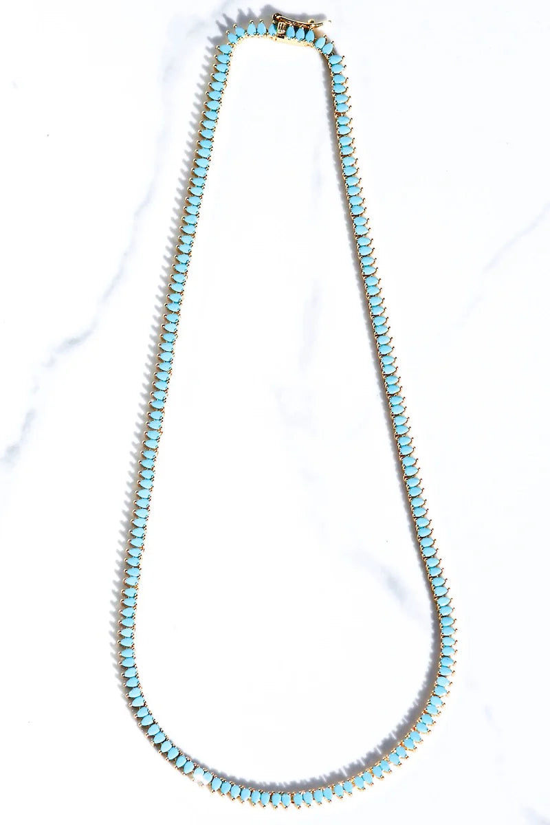 Crafted in 14K gold vermeil, this elegant teardrop necklace features a stunning arrangement of turquoise teardrop cubic zirconia stones that catch the light with every movement. Measuring 16 inches and features a double locking clasp for added security and peace of mind.