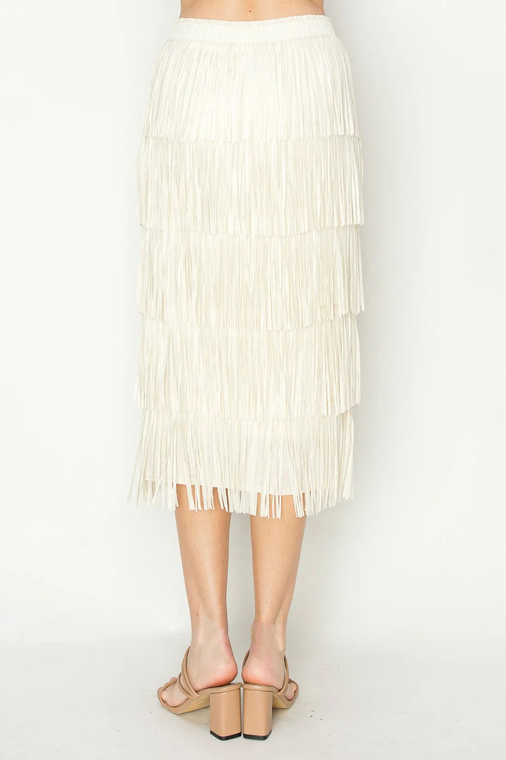 This mid-length skirt features an elastic waistband for a comfortable fit and an all over fringe design that adds a touch of fun to your outfit. This skirt has a stretch inside lining for added coverage.