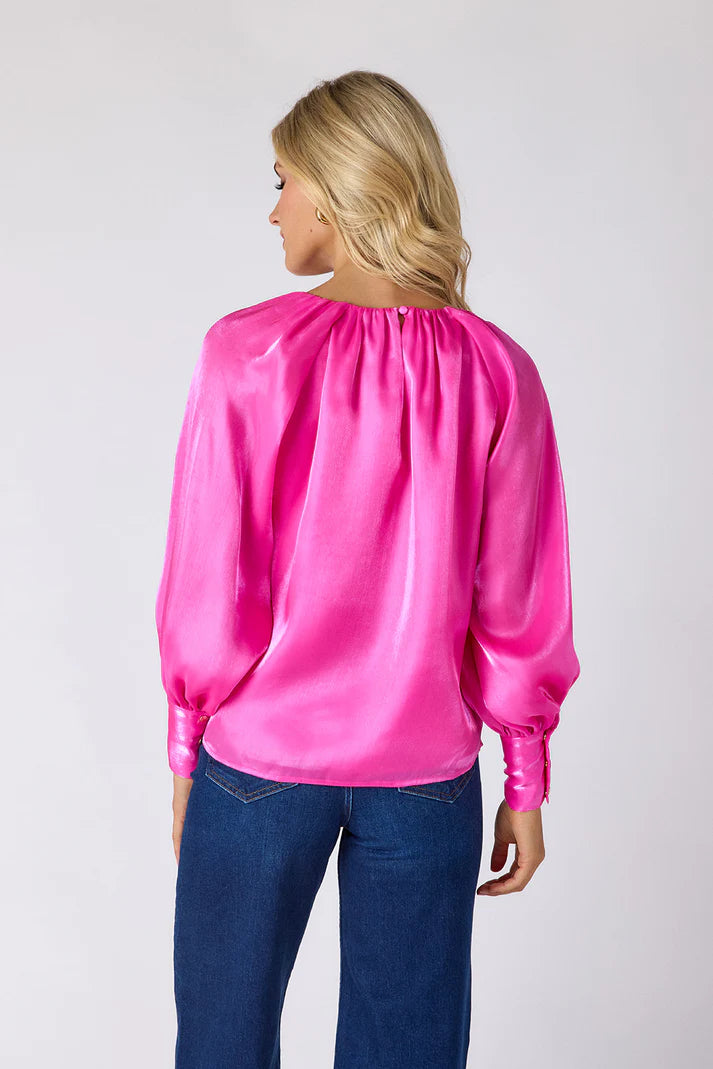 This effortlessly flowy style features a shirred neckline, full-length balloon sleeves, and gold snap details at the cuffs for a touch of shine.
