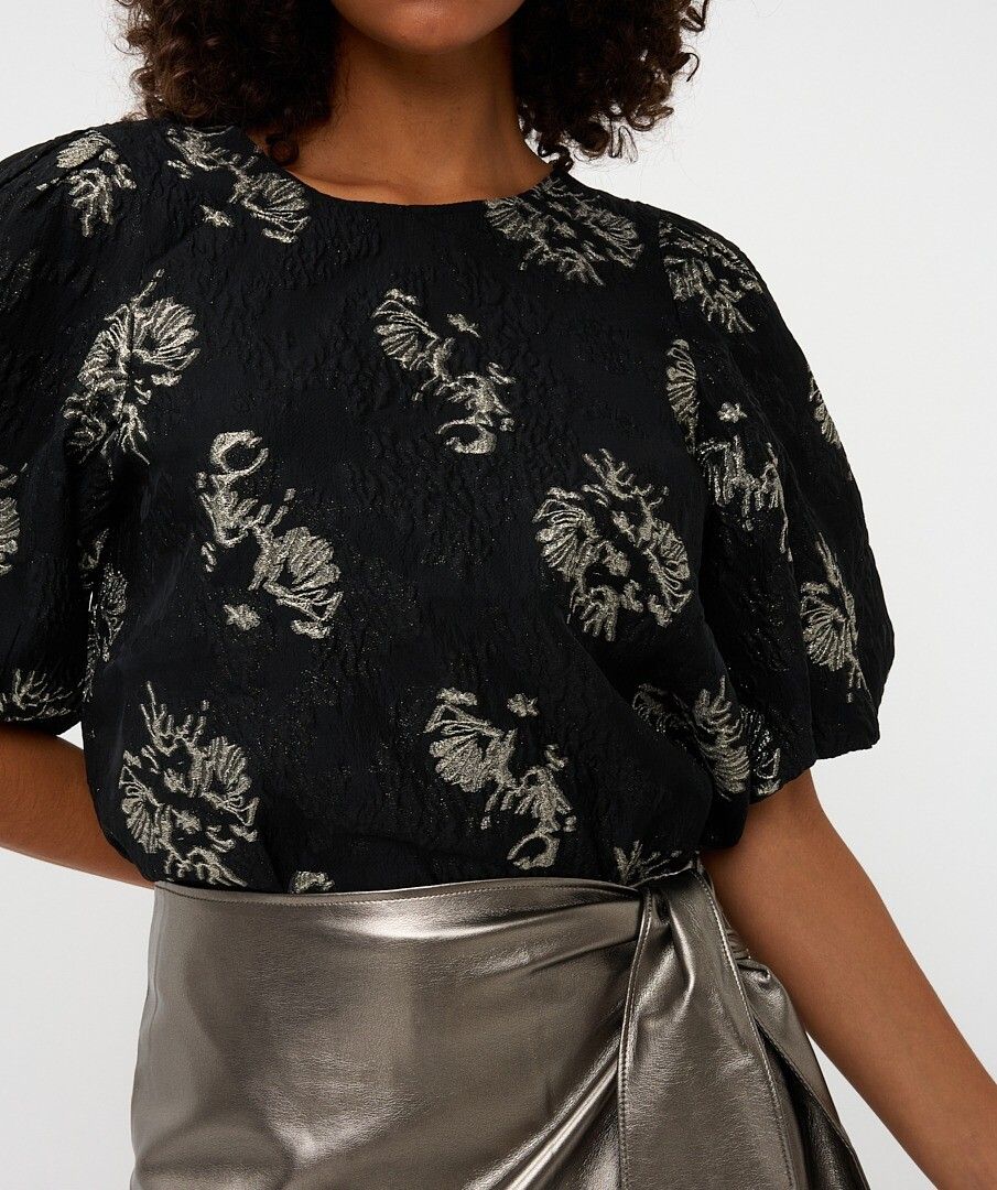 Chic jacquard top with a round neckline, a button closure at the back of the neck, and puff sleeves.