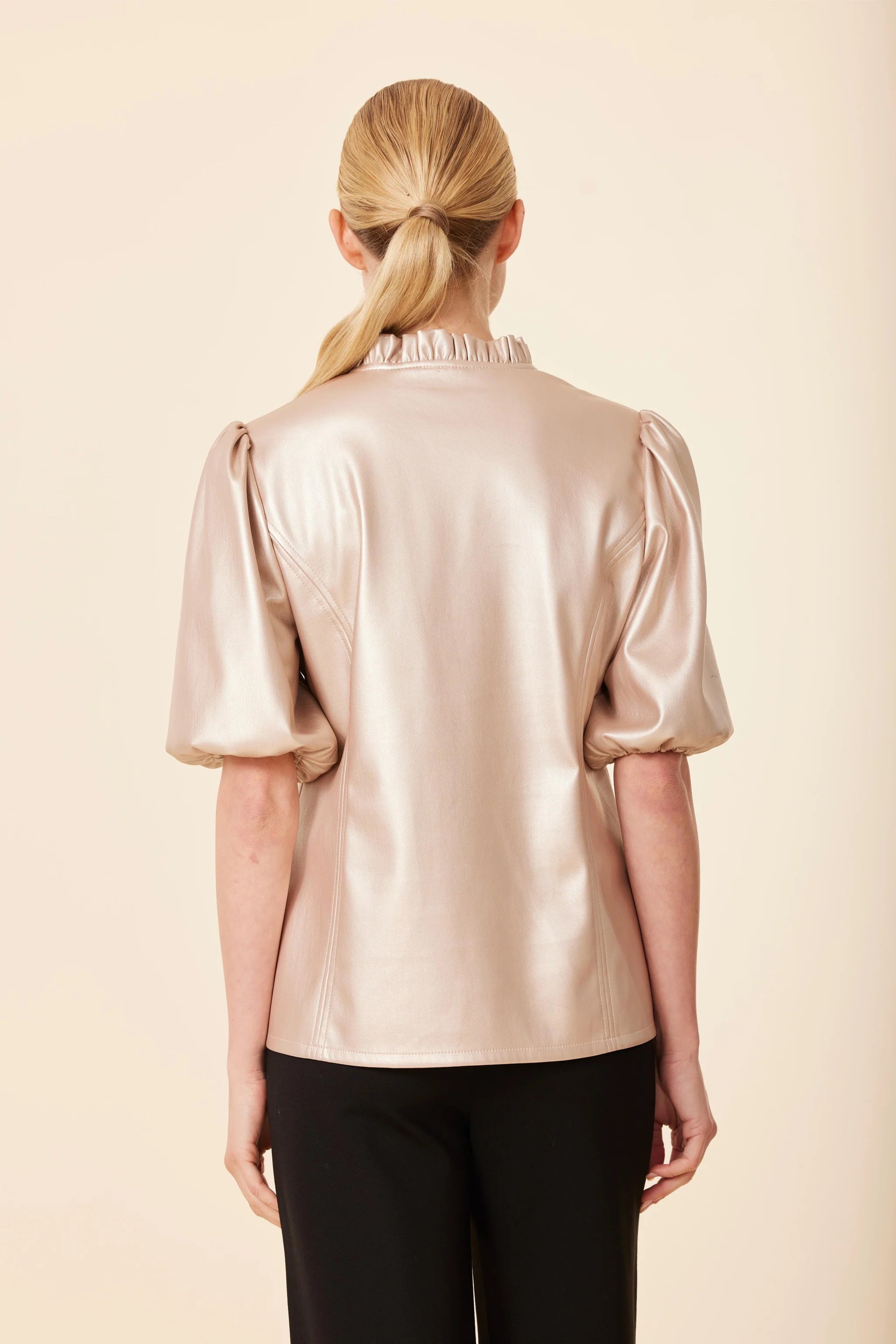Featuring a ruffled V-neckline and tailored seams, this elegant blouse is perfect for elevating both workwear and evening outfits.