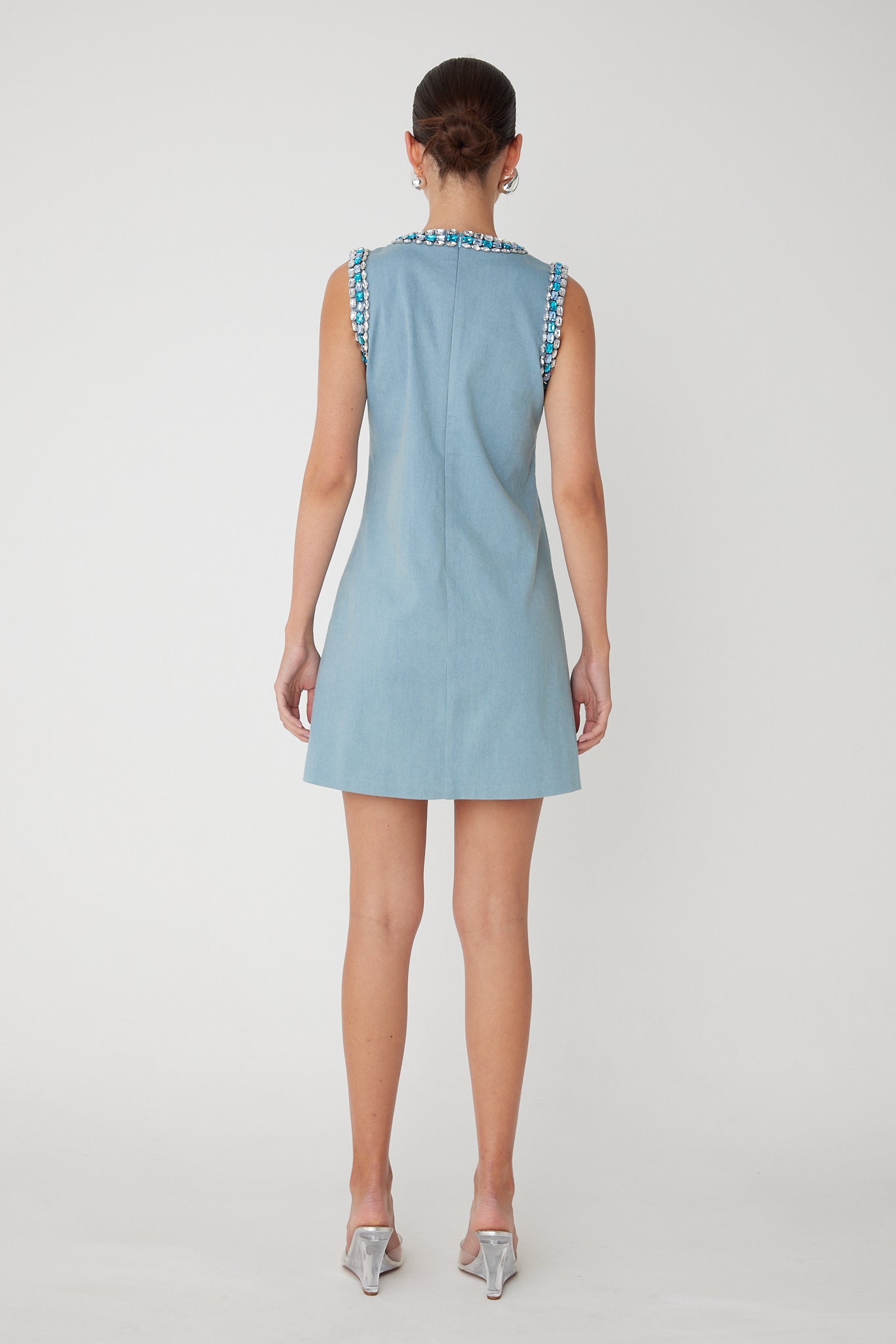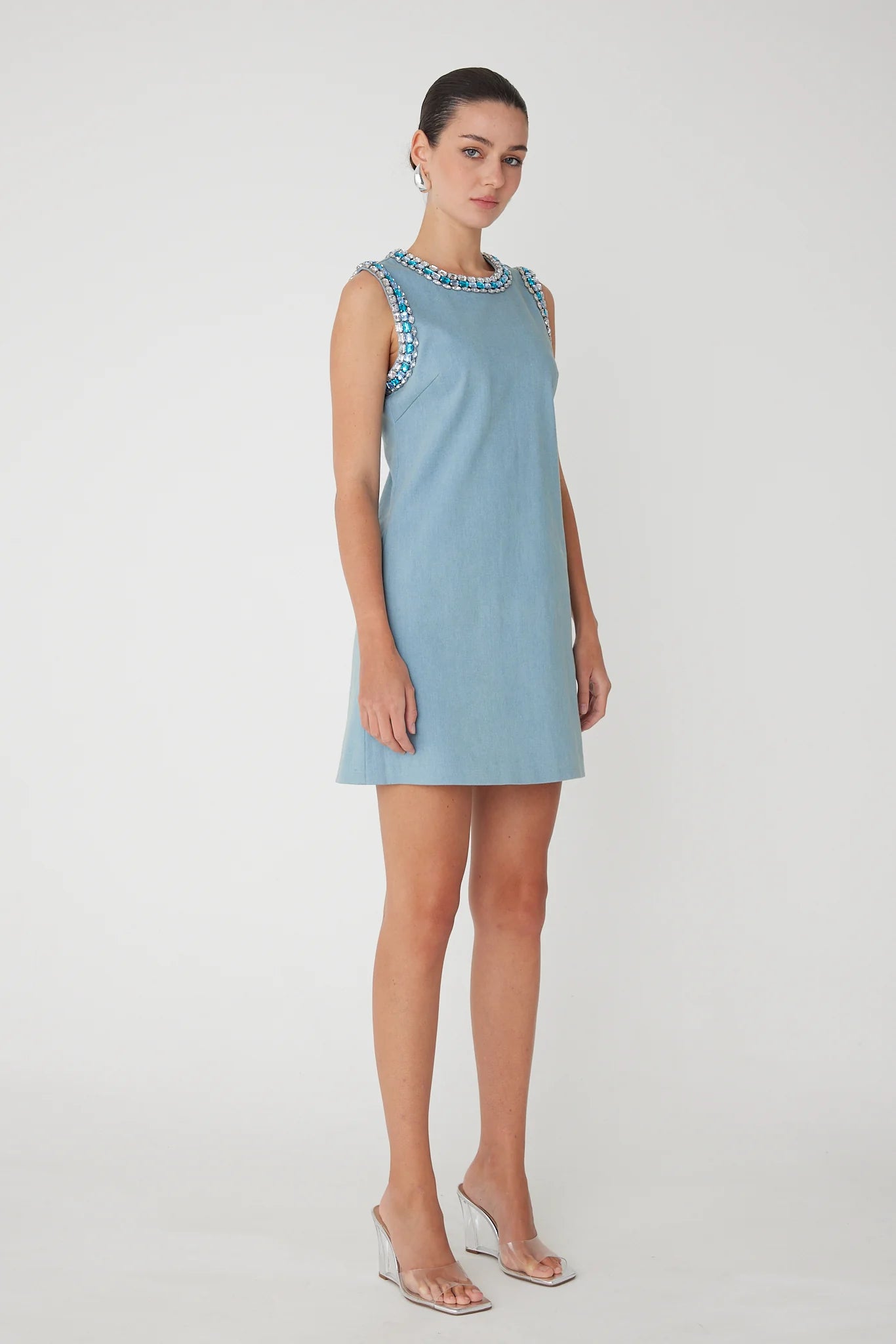 Elevate your everyday style with the Cleo dress, a refined A-line silhouette crafted from supple stretch denim. Delicate blue gemstone accents trace the edges, creating an understated luminescence that catches the light beautifully. The forgiving fabric moves with you while maintaining a flattering shape, making this piece an effortless addition to any wardrobe.